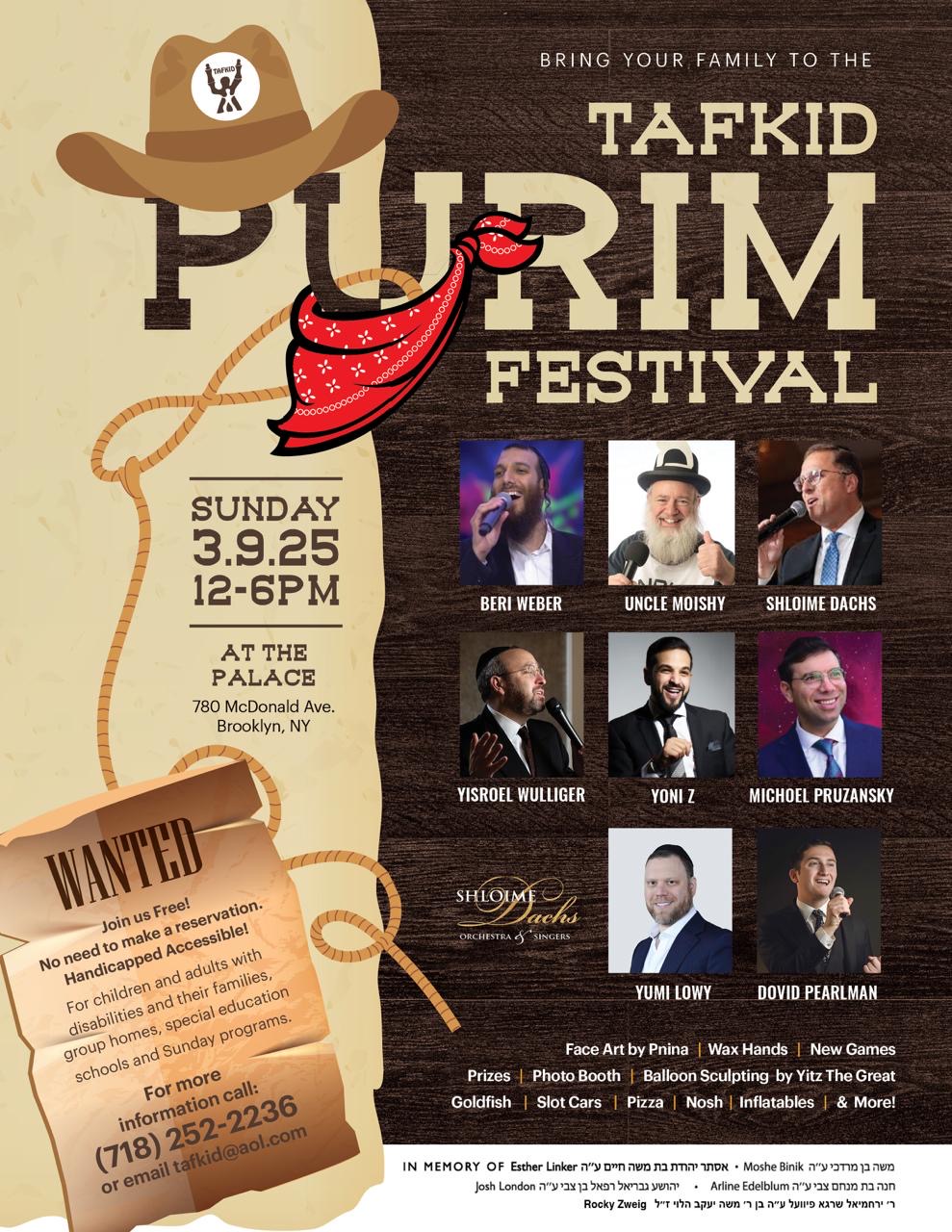 Tafkid invites children and adults with disabilities and their families, group homes, special education schools, and Sunday programs to the Tafkid Purim Festival!