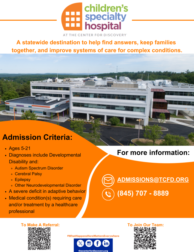 I wanted to share a wonderful resource that we connected with this week. OPWDD has partnered with the Center for Discovery to open a new hospital called "The Children's Specialty Hospital in Rock Hill".