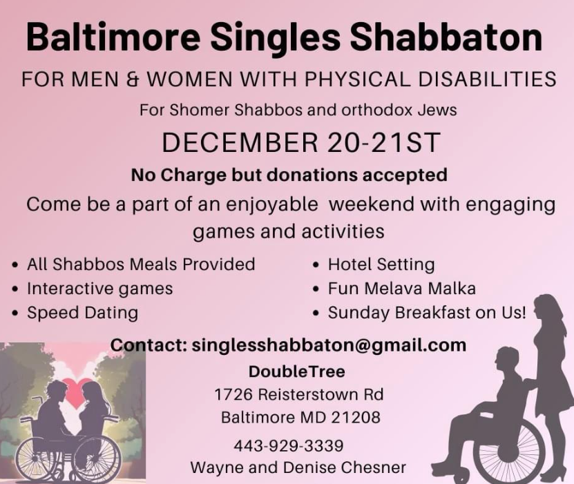 We wanted to share with you an exciting opportunity. On December 20-21st, there will be a Baltimore Singles Shabbaton for men and women with physical disabilities.