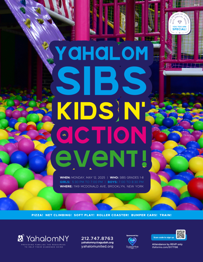 We are excited to invite our Yahalom Sibs to a fun-filled evening at Kids-N-Action. Join us for pizza, net climbing, soft play, bumper cars, and more!