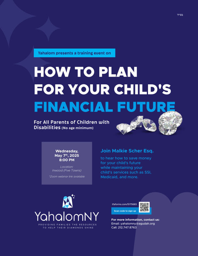 We are privileged to welcome Malkie Scher, Esq., who will guide us through strategies for securing your child’s financial well-being—while preserving essential services like SSI, Medicaid, and more.
