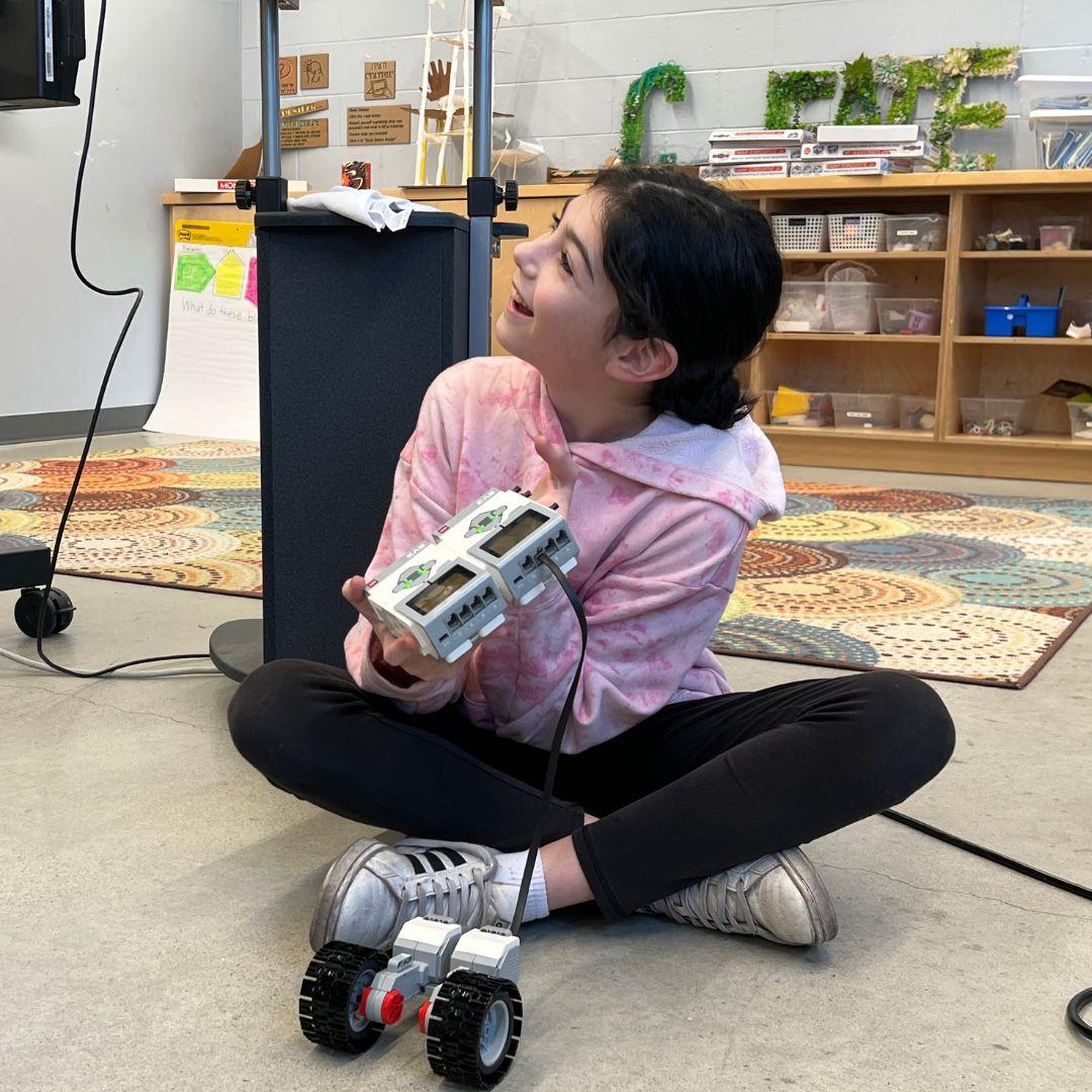 A Sixth Grade student programs a Lego EV3 Mindstorm robot. | |