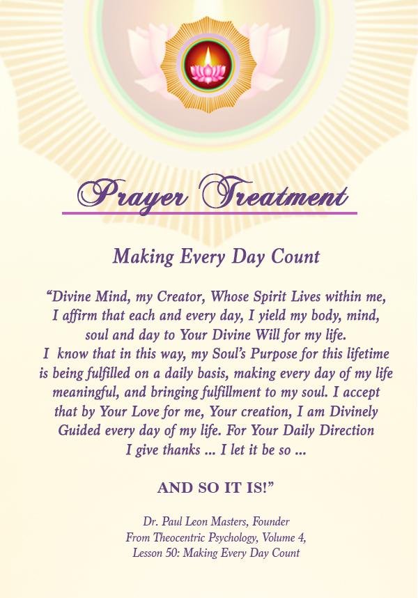 Our Father-Mother God who is in the kingdom of heavenly consciousness within our minds. Holy be your presence in our awareness. We open our minds to your kingdom of higher heavenly consciousness. Awaken our earthly direction in life to the universal will of your heavenly mind. Give us this day our daily nourishment of the presence of your spirit. And as you forgive us—so in turn, may we, by your presence in our minds forgive others. And inwardly guide us away from all that is not of your presence into your light. For yours is our true inner power and the glory of our true selfhood for ever and ever.