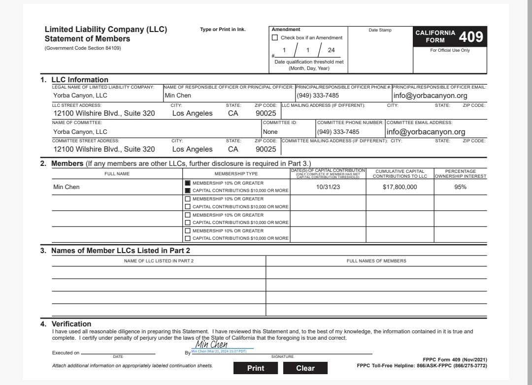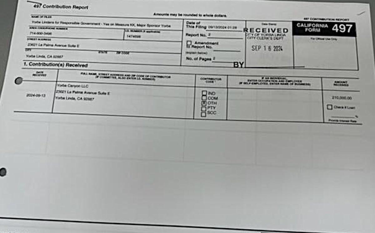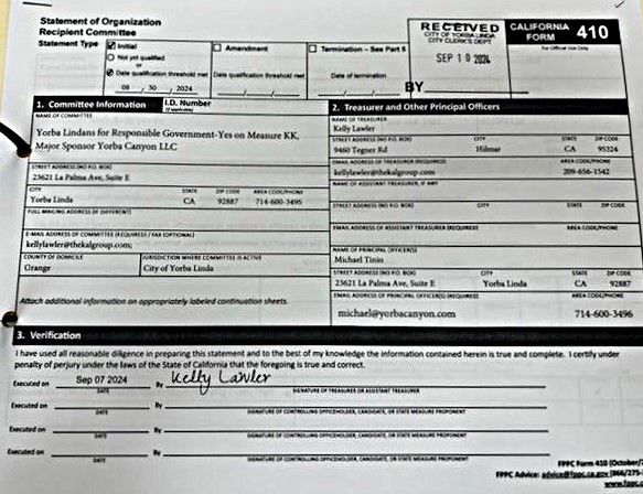 Min Chen filed to become a PAC, known as "Yorba Lindans for Responsible Government", Yorba Canyon LLC, on September 8, 2024. Yorba Canyon LLC, who is sponsoring Measure KK, deposited $210,000 that will be used to convince voters to approve the 340+ unit high-rise, high-density project that would replace the “ice palace”.
