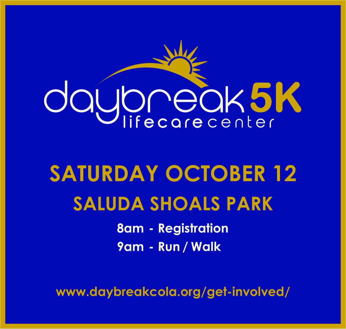 DAYBREAK 8TH ANNUAL 5K RUN/WALK: Saturday October 12 at Saluda Shoals Park. 8am Registration and 9am Run/Walk. There are six ways to participate and support the 5K.