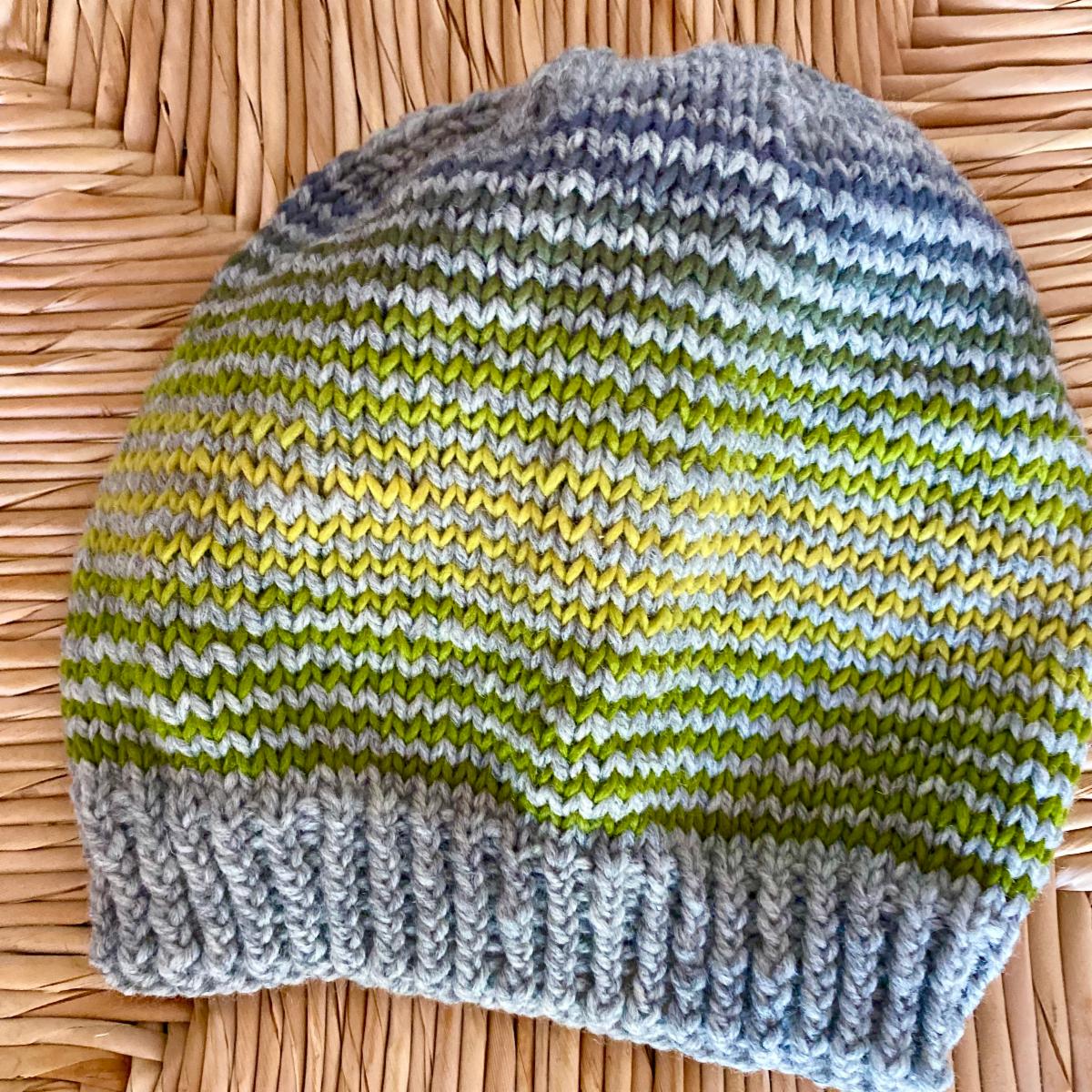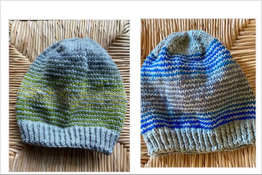 ✏️ Our sample knitting shows that you get two hats out of a single skein of each yarn. Manipulate the color by winding and rewinding to place a chosen color where you want it to be.