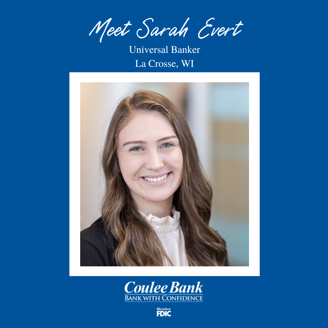 We are excited to introduce you to Sarah Evert, Universal Banker in our La Crosse branch. She was born and raised in Beaver Dam, WI, a small town on a lake north of Madison. Evert moved to La Crosse in 2019 to attend UW-La Crosse. She studied elementary education with a math minor. Once she graduated, she wanted to investigate different career options in math or finance before she stepped into the classroom. That’s when she found Coulee Bank.