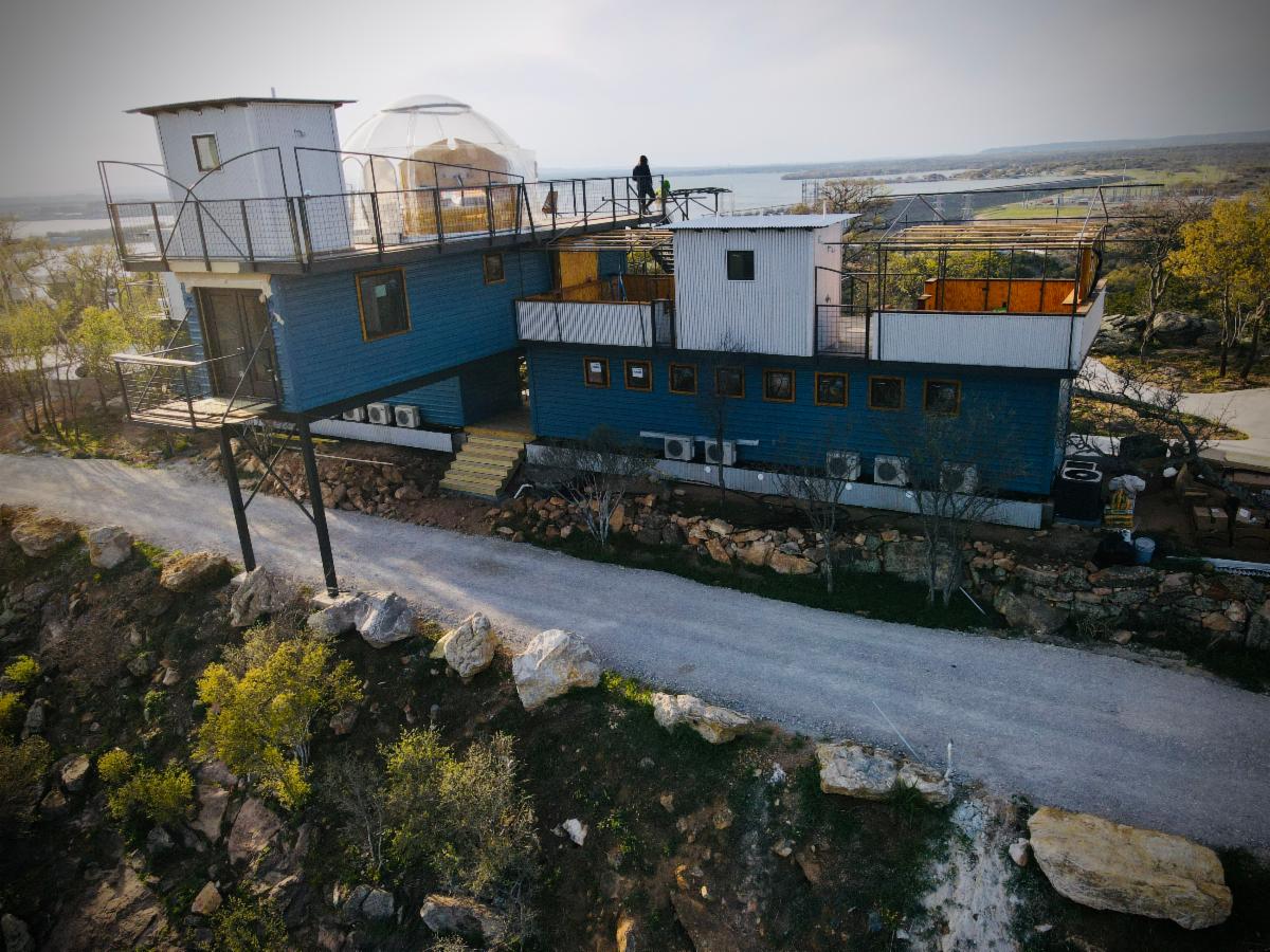 A short walk from Chapel Hozhoni is The Glampominium. The Glampominium at Hozhoni consists of three stacked shipping containers resting on a cliff overlooking Lakes LBJ and Marble Falls. The bottom floor houses a luxury bride’s suite, a place to prepare for that special day. The second floor is the 40-foot “Box of Curves” – a luxury suite with curved walls and a barrel-vaulted ceiling – inside a shipping container!