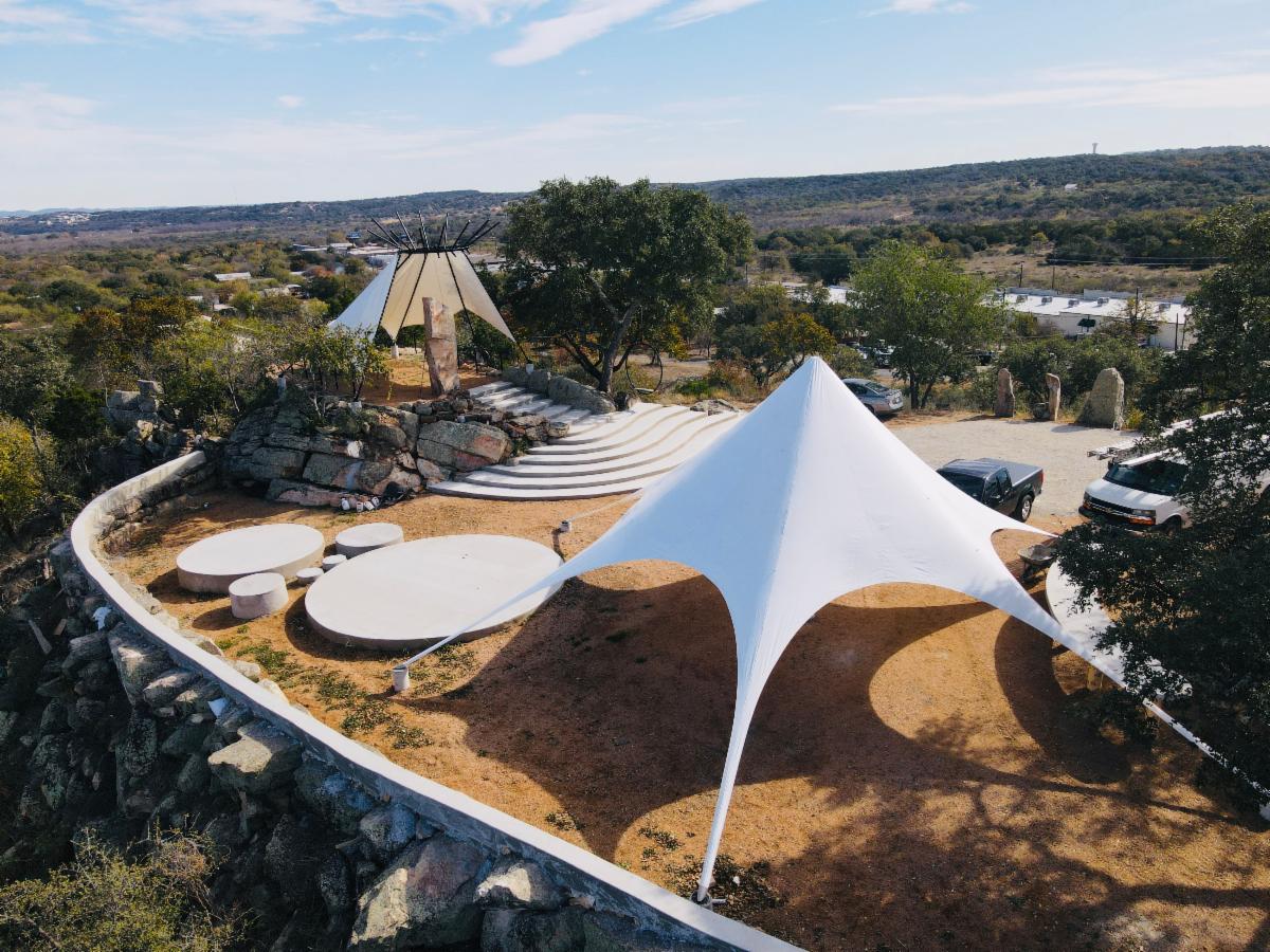 Hozhoni on the Hill is located in Cottonwood Shores, between Marble Falls and Horseshoe Bay, about an hour from downtown Austin. The venue is available for weddings, yoga retreats, family reunions, and other gatherings.