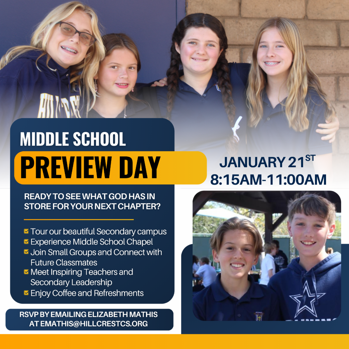 At Hillcrest Christian School, our mission is to raise up the next generation to impact the world for Jesus Christ. Middle school is a pivotal season in that journey, as students begin to take greater ownership of their faith, learning, and leadership. We invite your family to Middle School Preview Day on Wednesday, January 21st to experience firsthand how Hillcrest partners with parents during these formative years.