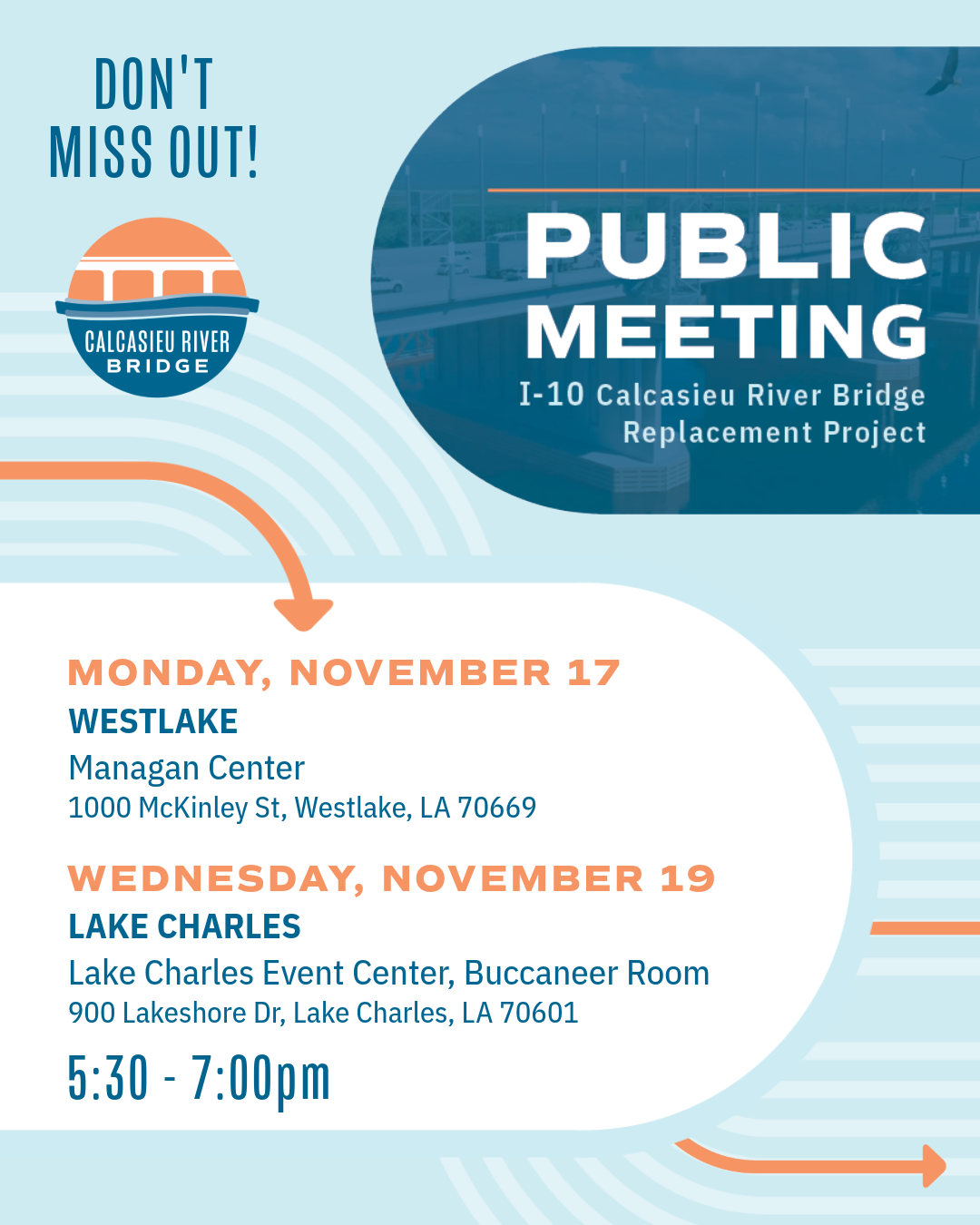 The project team invites the public to two open houses next week. The first is scheduled for Monday, Nov. 17 from 5:30 - 7:00 p.m. at the Managan Center in Westlake, and a second meeting is set for Wednesday, Nov. 19 from 5:30 p.m.to 7 p.m., at the Lake Charles Event Center (Buccaneer Room).