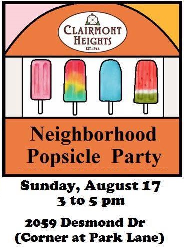 Thanks for joining our neighborhood association for the 2025-2026 year. Please join us at our kickoff event for the year, the Summer Popsicle Party, on Sunday, August 17th, from 3-5 pm.
