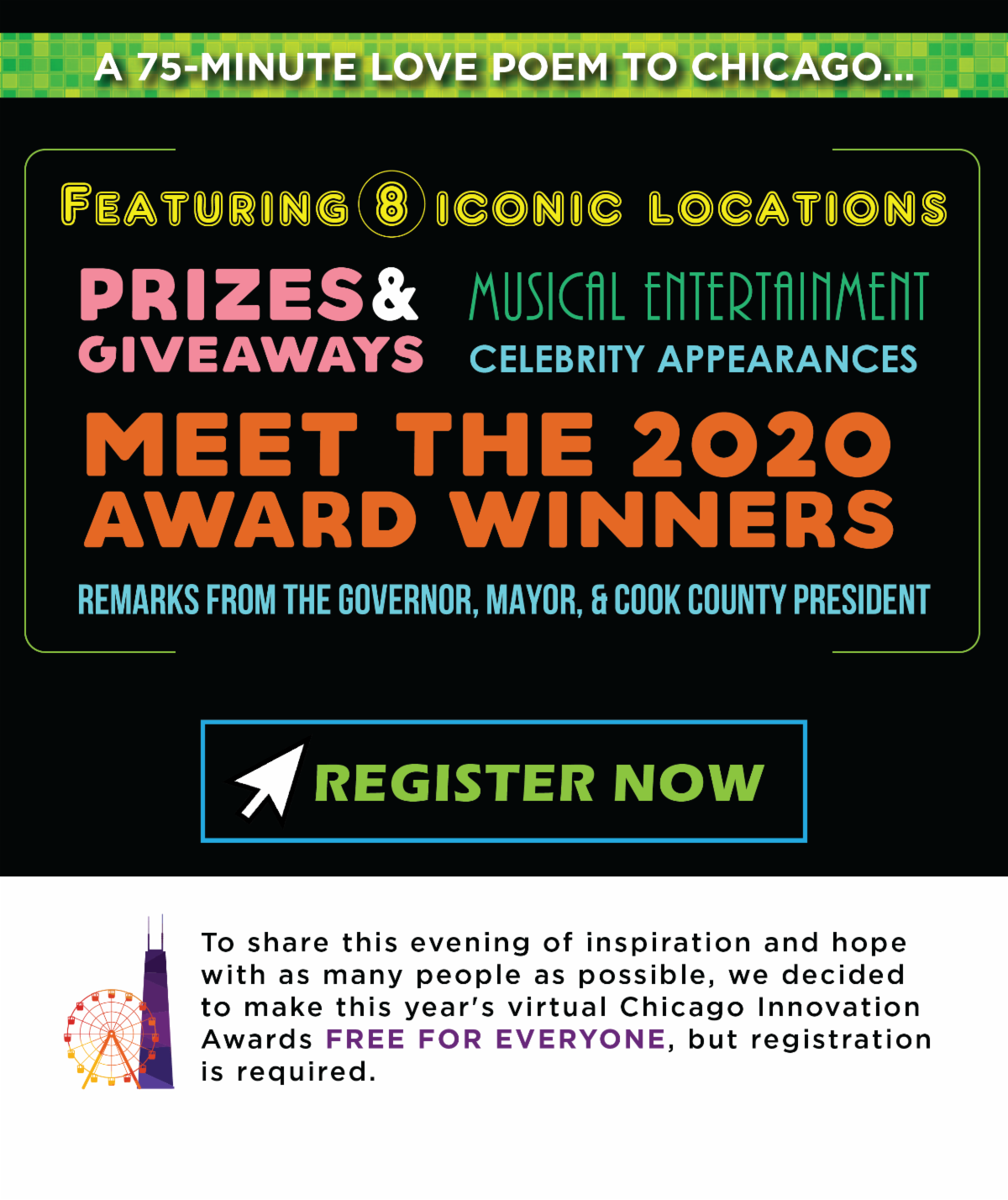 Join us in celebrating the grit, resiliency, and spirit of innovation that is powering our city into a re-imagined future. Broadcasted live from Chicago, embark with us on a special tour throughout the city we love as we meet the winners of the 2020 Chicago Innovation Awards.