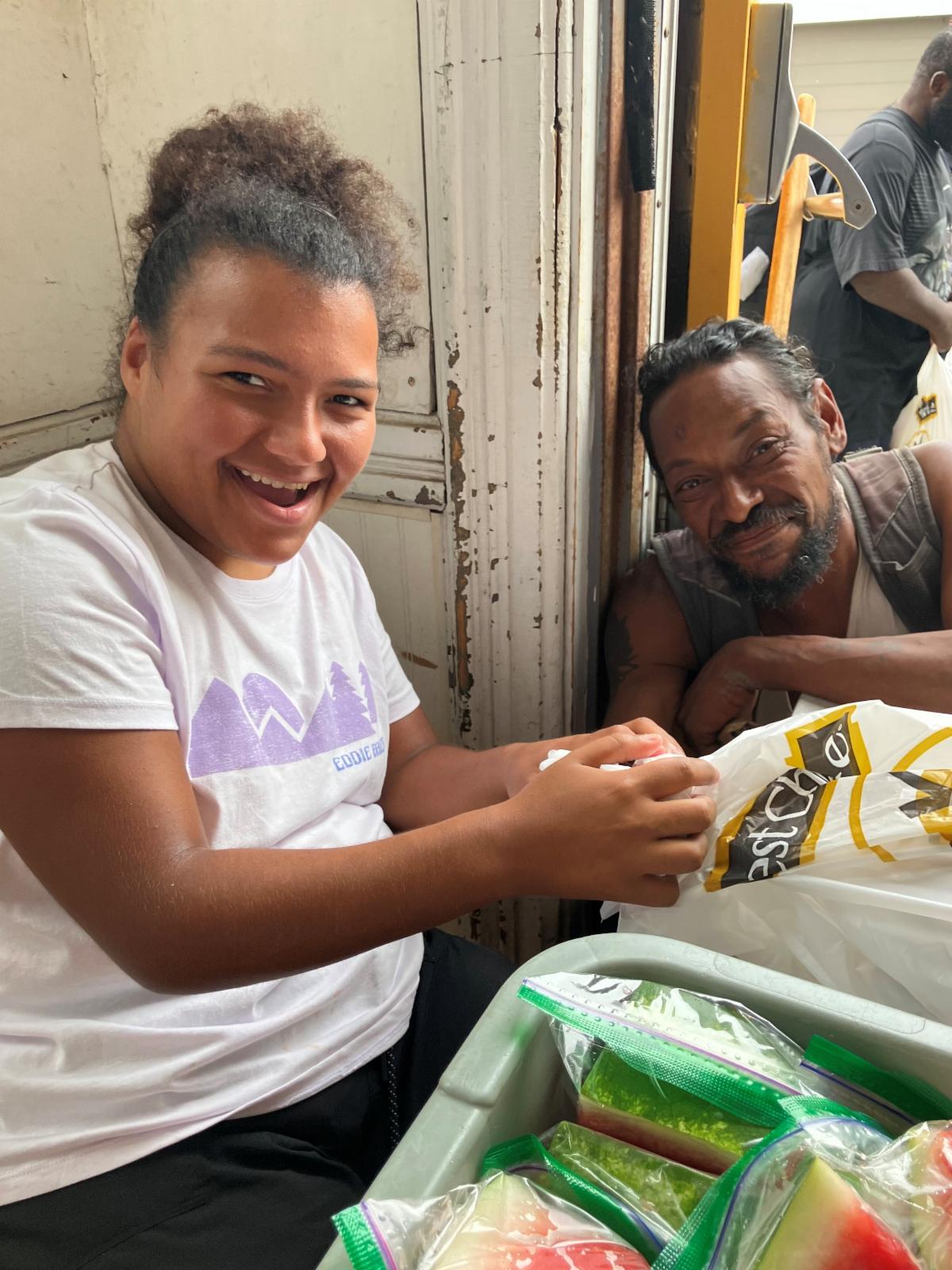While researching volunteer opportunities for Emma, Teresa read about our Sack Lunch Program, sharing, “I immediately thought it might be just the sort of thing we were looking for, as Emma enjoys `sensory’ kinds of activities. The two things that drew us to the Sack lunch program were that Emma loves filling containers and she loves people. So, making sack lunches and handing them out to people who would benefit from the joy she brings seemed like a perfect fit.”