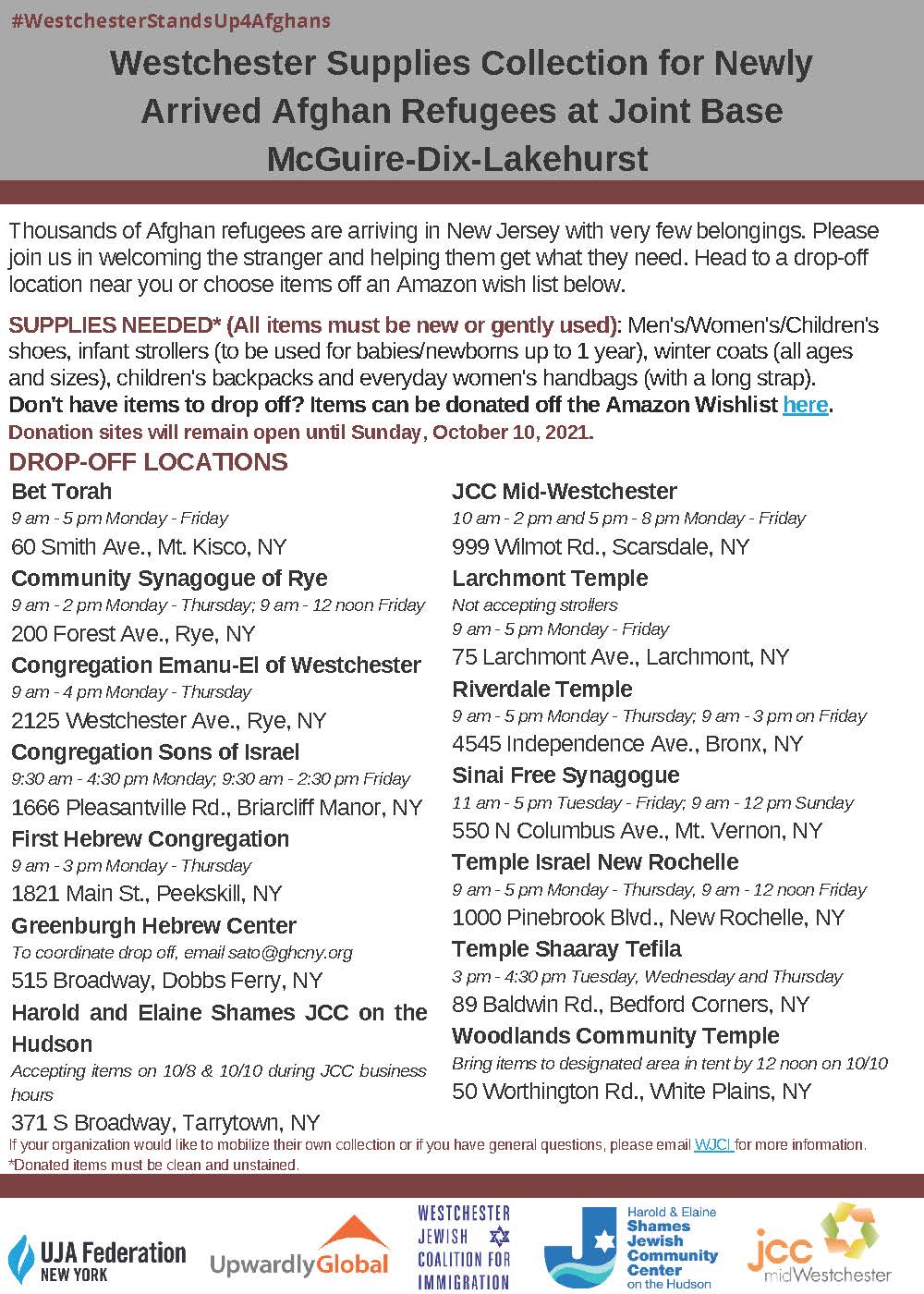 Drop-Off at Sinai Free Synagogue. Contact Caron Gelles for more information: 914.668.4350
