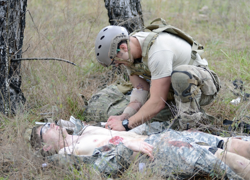 A student in the Special Operations Combat Medic Course at the U.S. Army John F. Kennedy Special Warfare Center and School treats a simulated patient during casualty training at Fort Bragg, North Carolina. Enlisted service members who completed the course specialize in trauma management, infectious diseases, cardiac life support and surgical procedures and qualify as highly trained combat medics with the skills necessary to provide initial medical and trauma care and to sustain a casualty for up to 72 hours. (U.S. Army photo by K. Kassens)