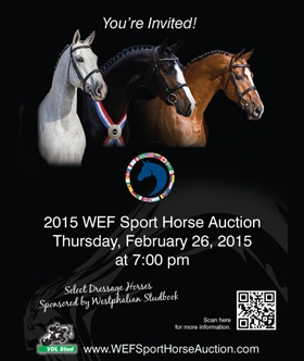 The 2015 Sport Horse Auction will be held on February 26 at 7 pm at The Stadium at PBIEC. The auction will showcase some of the elite show jumpers and hunters from VDL Stud in the Netherlands and will also feature two young top-class dressage prospects from Dressurstall Sandbrink Stud in Germany. The VDL Auction Viewing will be held in The Wellington Club overlooking the horses in the International Arena on Tuesday, February 17, at 4 pm. The fine VDL horses will be available for viewing at Ossian Ventures on February 16-25 from noon to 6 pm. The dressage horses will be available for viewing at The Stadium at PBIEC during the same time. On Wednesday, February 25, 2015, from 9 am- 5pm, the VDL horses will be available for trials by appointment at Ossian Ventures. Please contact Mr. Janko van de Lageweg at 561-324-0256 or +01131651815225 to set up an appointment.  The dressage horses are also available for trial by contacting Mrs. Rhegan White at 912-257-0064 or white@westfalenpferde.de. To register as a bidder for the auction, please contact Melanie Peterson at 561-870-6587 or melanie@horsemls.com. Horse photos, videos, and the registration information can be found at www.wefsporthorseauction.com.