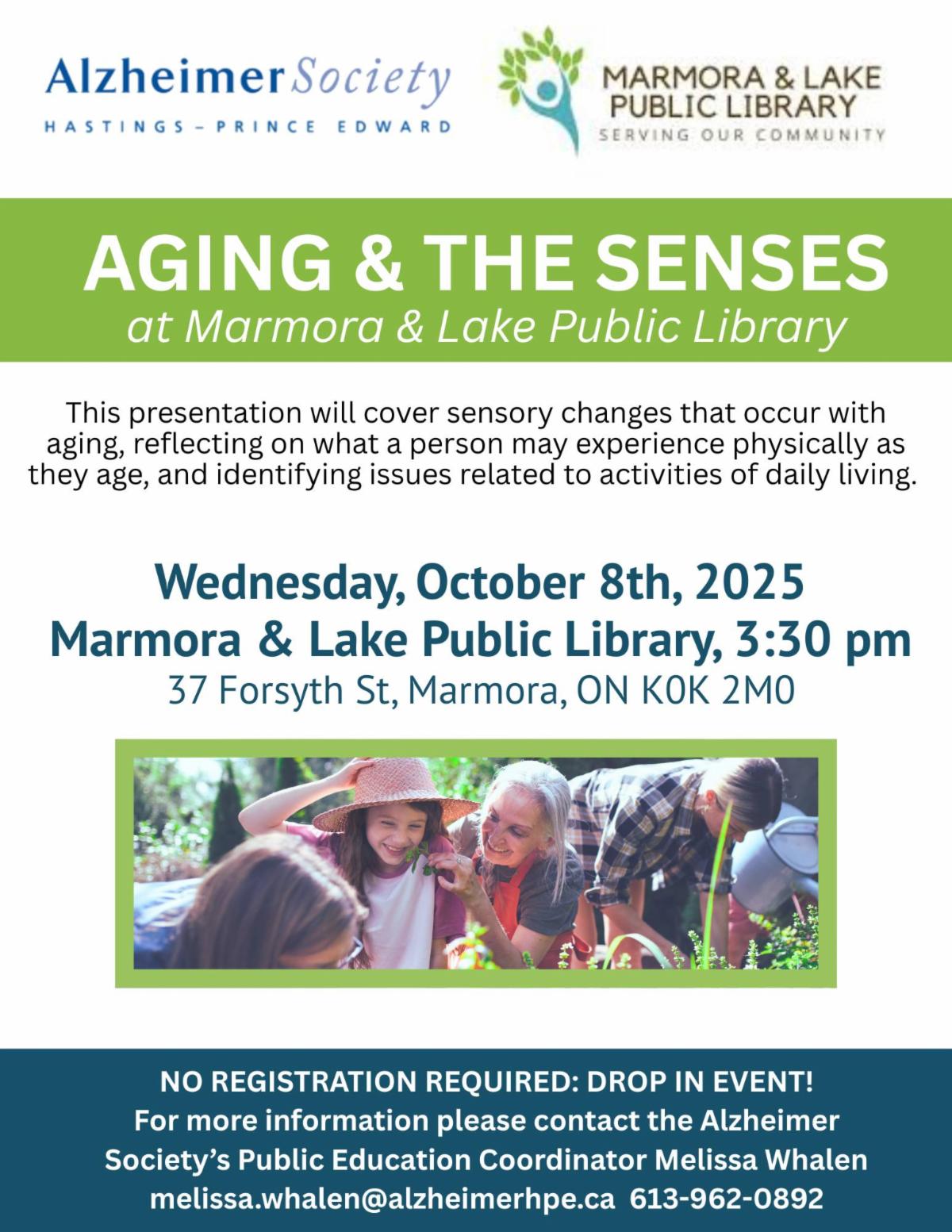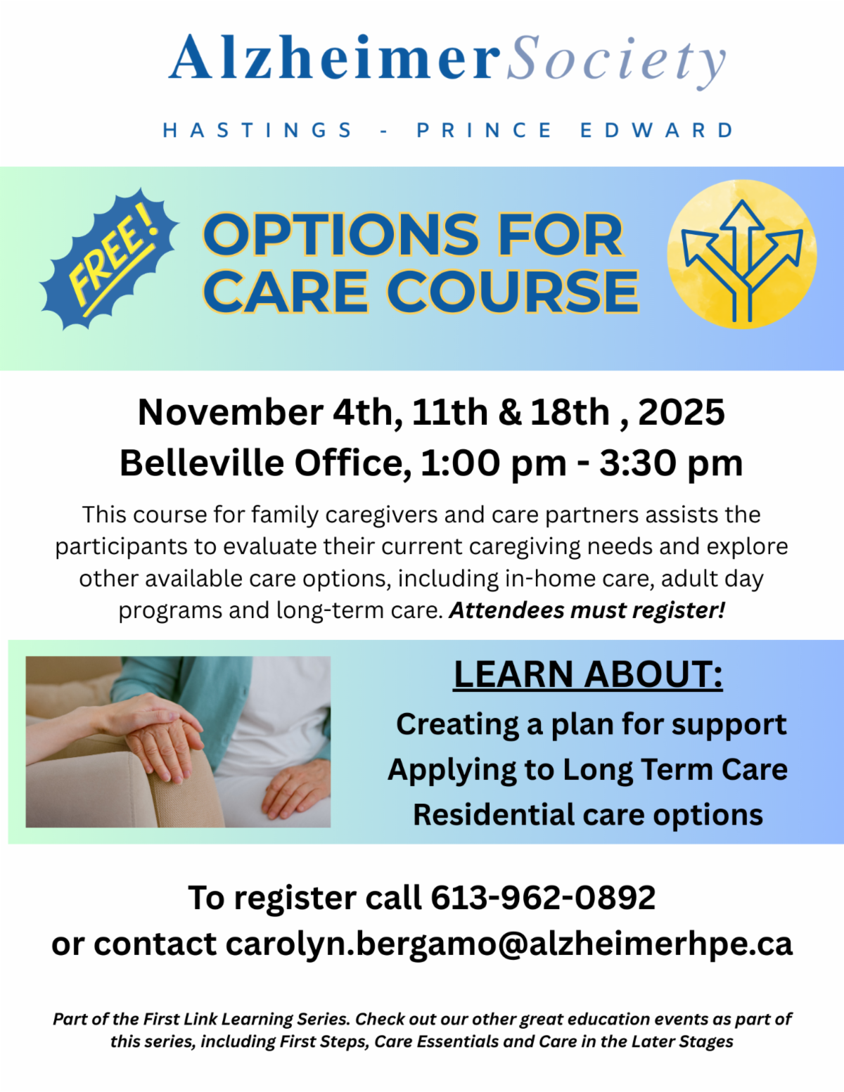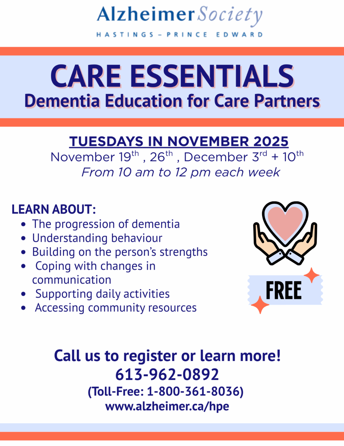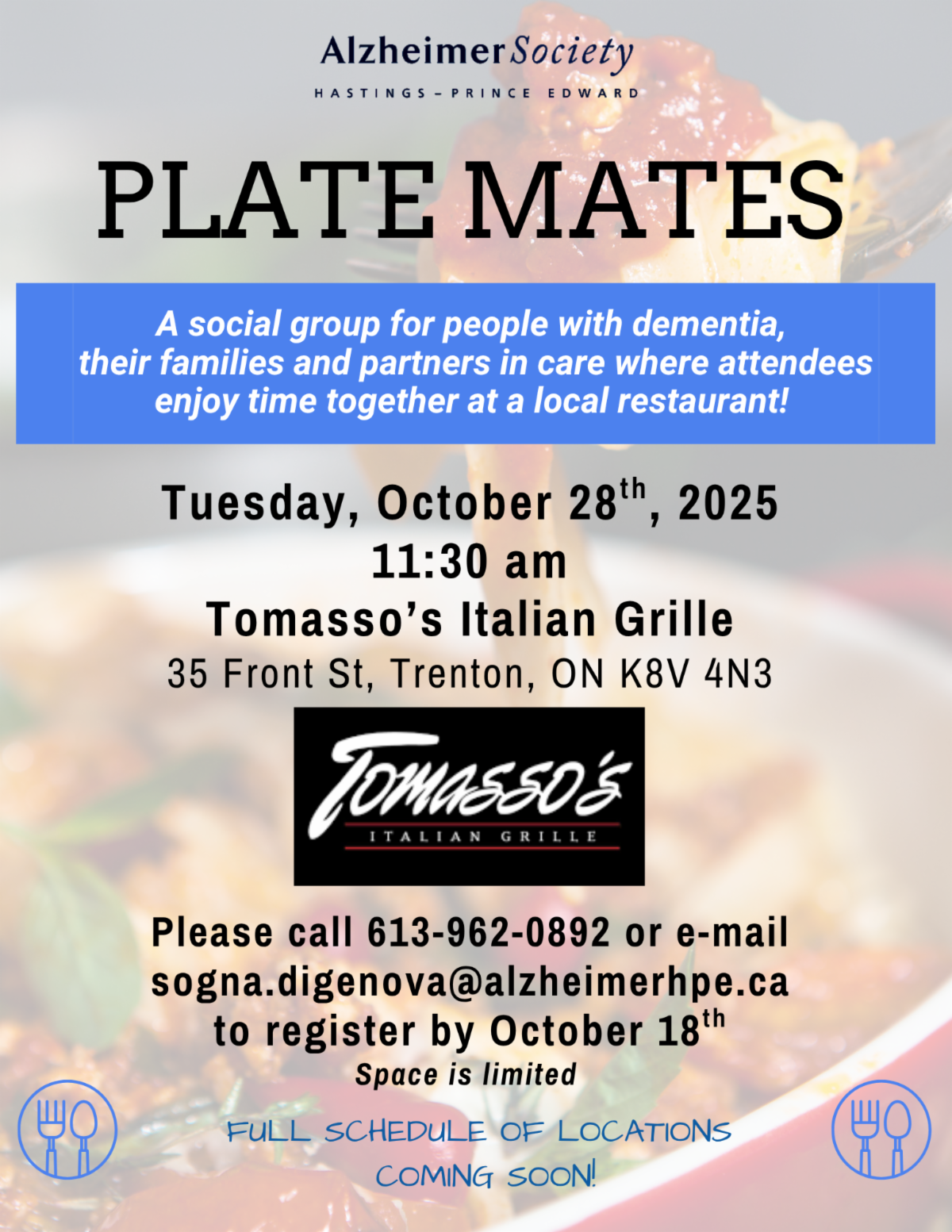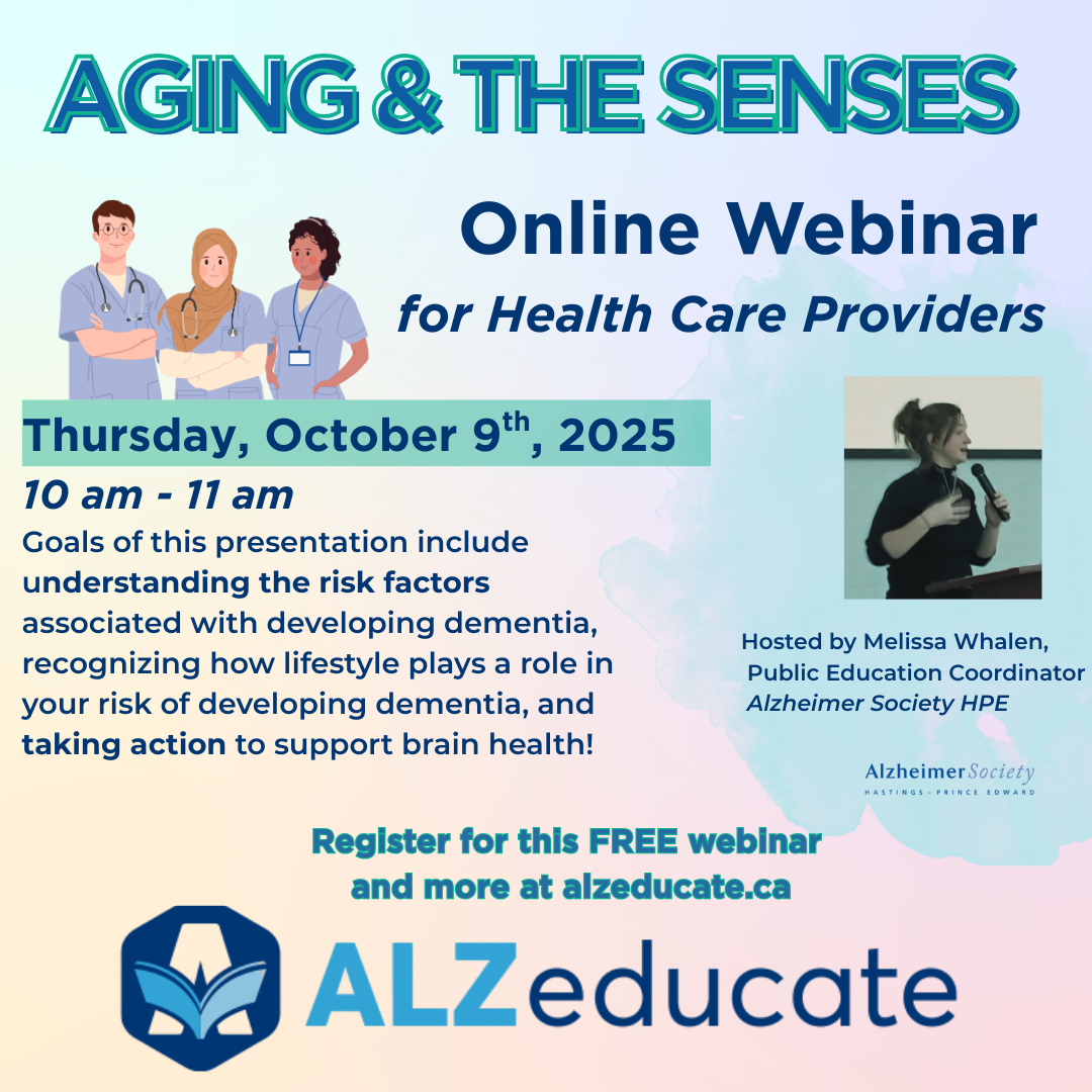 | | Plate Mates: October & November 2025 | | We are bringing back Plate Mates, a social event for persons living with dementia and their partners in care that takes place at a different local restaurant in the area each month. In October, we are going to Tomasso's in Quinte West on October 28th. For November, we are headed to Swiss Chalet in Belleville on November 25th. Please call 613-962-0892 to register as space is limited and events are subject to change. | | Aging & The Senses: Marmora and Lake Public Library October 8th | | Happening today at 3:30 pm at the Marmora & Lake Public Library. Everyone welcome! 37 Forsyth St, Marmora. | | Care in the Later Stages in October | | "Care in the later stages" in one of the final courses in the First Link Learning Series. This is a 3-week learning series that is designed to help family members and friends of persons with dementia understand what to expect in the later stages of dementia. Hosted in Bancroft this October, (October 9th, 16th, and 23rd) we are asking all those interested to register. Call 613-962-0892/613-332-4614 or email candice.leuschner@alzheimerhpe.ca. | | Options for Care in November | | Options for Care is an additional module of the First Link Learning Series for care partners. This education is for care partners, family members and friends to learn more about caring for individuals living with mid to late-stage dementia and to discuss options for care. Join us November 4th, 11th & 18th at our Belleville office from 1 - 3:30 pm each week. Please call to register. | | Care Essentials in November | | Family members and care partners of people with Alzheimer’s disease and other dementias are invited to attend the FREE Care Essentials learning series this November (part of the First Link Learning Series). Participants will learn about the link between brain changes and behaviour, problem solving strategies, new approaches for communication, and how to best support daily activities. Participants will also learn about other resources to support them in their role as a care partner. November 19th, 26th, December 3rd & 10th! Please call to register. | | Care Partner Education Day: November 10 | | Join us November 10th for the Kay Stafford Care Partner Education Day in Quinte West. This event is made possible with support from the Kay Stafford Memorial Fund from the Trenton Memorial Hospital Foundation. Hear from industry experts and special guest speakers. FREE event! Call 613-962-0892 to register or learn more. | | Aging & The Senses on AlzEducate | | |