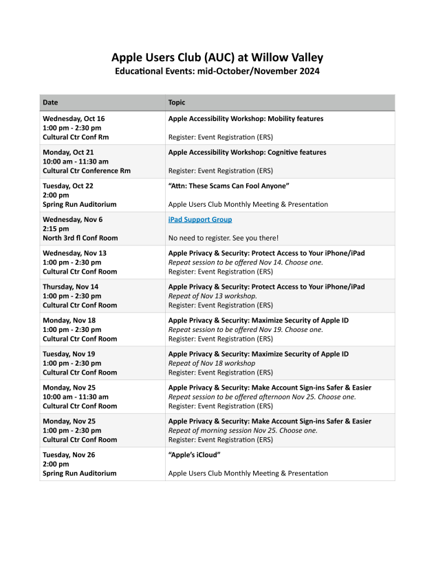 October is Cybersecurity Awareness Month. In line with that theme, Chase Bank recently sent its customers an email with the subject “Attn: These scams can fool anyone.” The bank’s email shared spam examples and offered excellent advice to its customers on how to better protect their digital lives. The advice and tips provided were universal and are worth sharing with you - in a dramatic fashion. Our October presentation will include participation by residents, listening to audios of spam calls, viewing typical spam emails and text messages, and more.