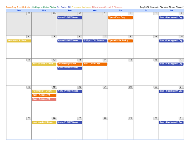 Arizona Fly Casters' monthly meeting will be Tuesday, August 13, at the American Italian Club 7509 N. 12th Street, Phoenix, AZ. Speakers are Karen Gremminger and Patti Nix on Casting for Recovery.