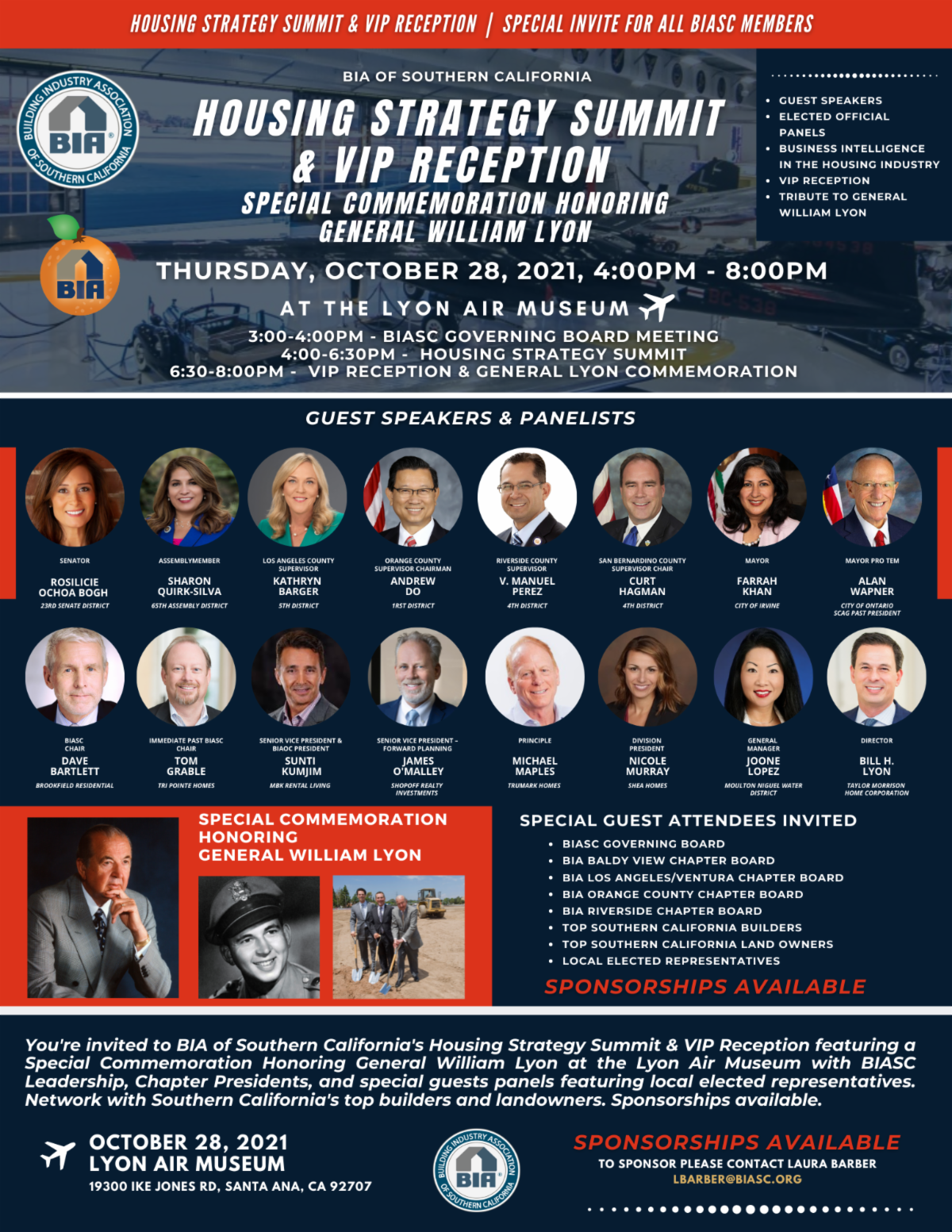 You're invited to BIA of Southern California's Housing Strategy Summit & VIP Reception featuring a Special Commemoration Honoring General William Lyon at the Lyon Air Museum with BIASC Leadership, Chapter Presidents, and special guests panels featuring local elected representatives. Network with Southern California's top builders and landowners. Sponsorships available.