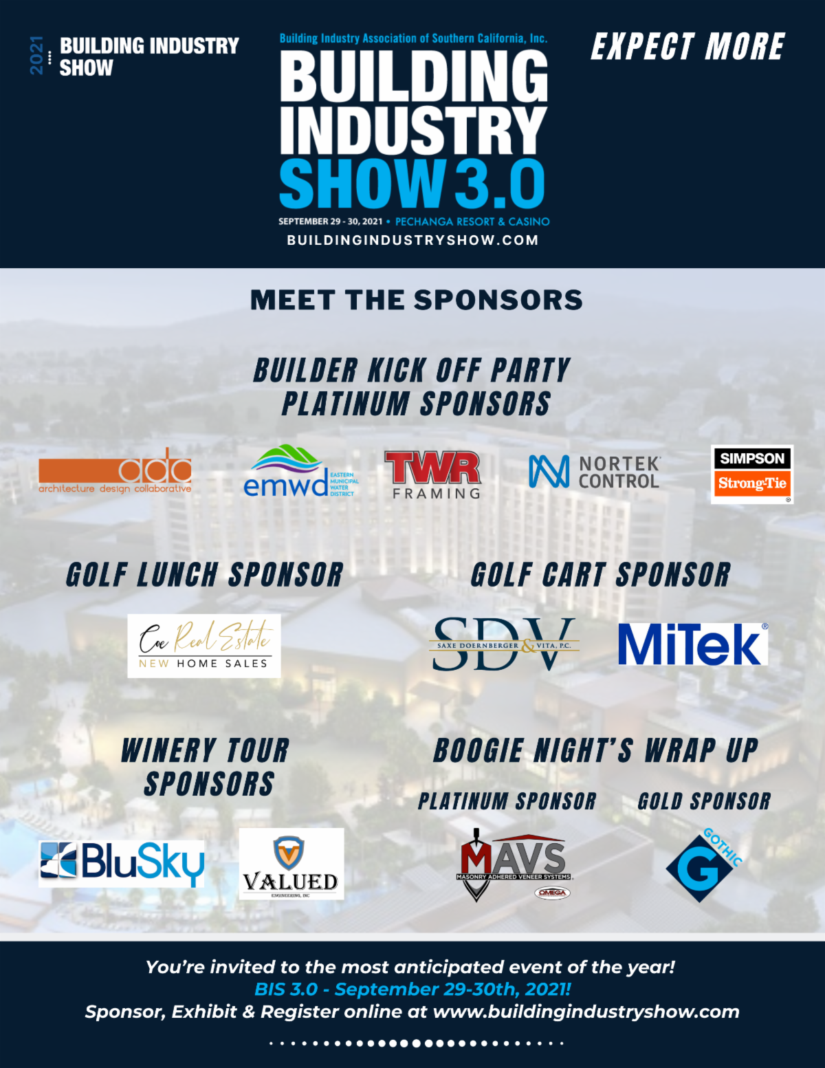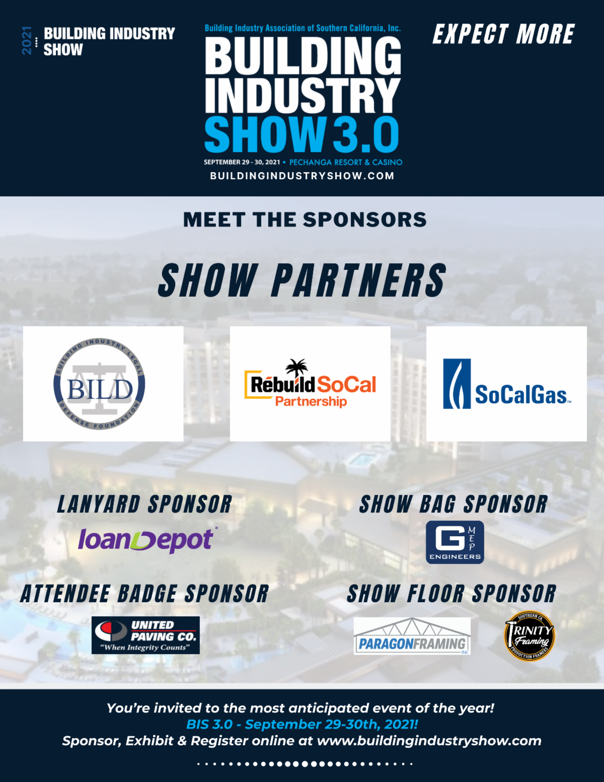It's officially September...which means ONLY 27 DAYS till the Building Industry Show 3.0 at Pechanga Casino & Resort on September 29-30th! A few sponsorships are still available, and exhibitor space is limited - Register today to attend, sponsor, and exhibit by visiting our BIS website or by contacting llundrigan@biasc.org.