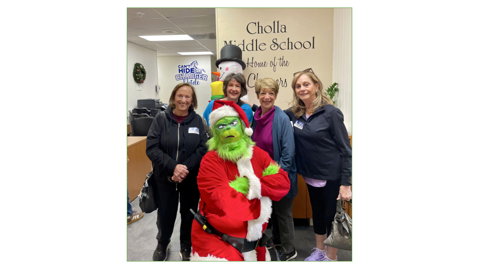 | | SPECIAL NOTE ABOUT FULL GROUPS: Even a group that has reached its maximum enrollment may have openings from time to time - if you are interested in a particular group, contact the facilitator(s) to see if space is available. Very often there is! A $5 guest fee will apply. | | Community Outreach: Through the generosity of Linda Perlman who volunteers at the Mustang Library and rescues used books for us, Pearle Wisotsky Marr and Ellen Kirschenbaum deliver some books to the Wisotsky Boys and Girls Club in Peoria. Additional books are being donated for elementary and preschools to Rosie's House. | | Mitzvah Mavens and another Dream Bus Volunteer at Cholla Middle School in December | |