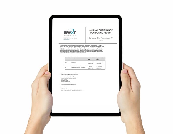 BWXT Medical is licensed by Canada’s nuclear regulator, the Canadian Nuclear Safety Commission (CNSC). As part of our licence, we submit a comprehensive Annual Compliance Report to the CNSC each year to demonstrate adherence to our commitment to operate a safe Class IB nuclear substance processing facility, as well as demonstrate compliance with the applicable regulations and licence conditions set by the CNSC.