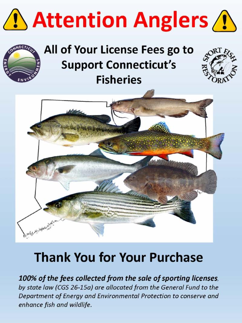 100% of your investment in a fishing license comes to the Bureau of Natural Resources to support fisheries programs (Connecticut General Statutes 26-15, 26-15a, and 26-15b).