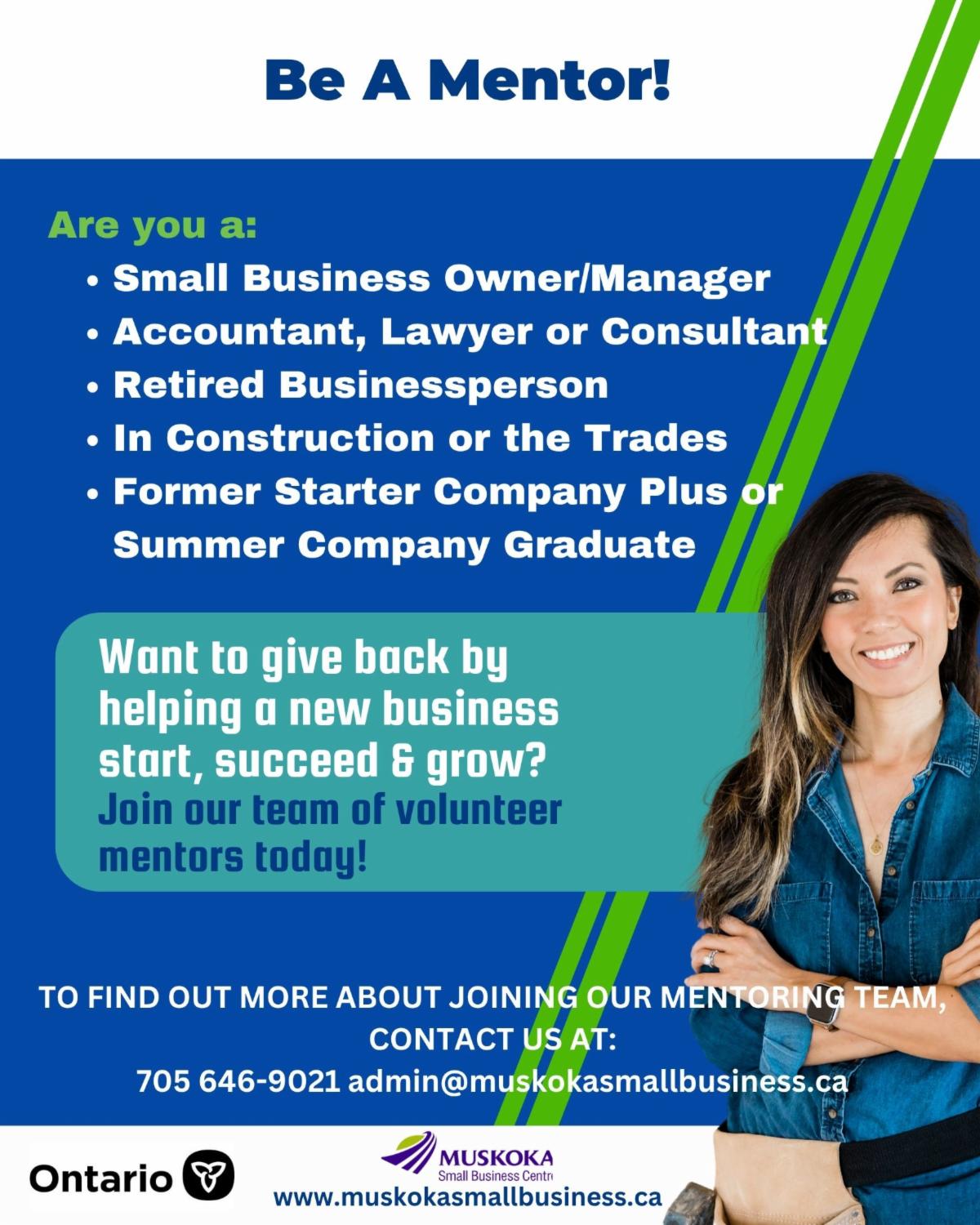 Help new businesses start, succeed and grow by becoming a volunteer mentor with the Muskoka Small Business Centre. Learn More.