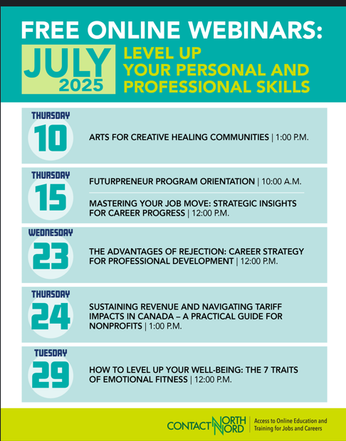 Level up your personal and professional skills with free online webinars from Contact North. Contact Kelly Dunlop to learn more and register.