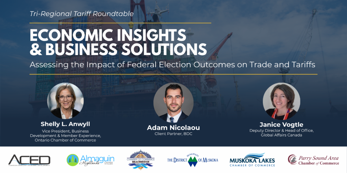 You're invited to a dynamic post-election roundtable bringing together regional business leaders, policymakers, and economic experts to explore the future of trade, tariffs, and economic resilience in Parry Sound–Muskoka–Almaguin. Hear directly from the Ontario Chamber of Commerce, Business Development Bank of Canada, and Global Affairs Canada, plus opening remarks from Muskoka District Chair Jeff Lehman. Enjoy insightful discussion and stick around for local snacks and networking.