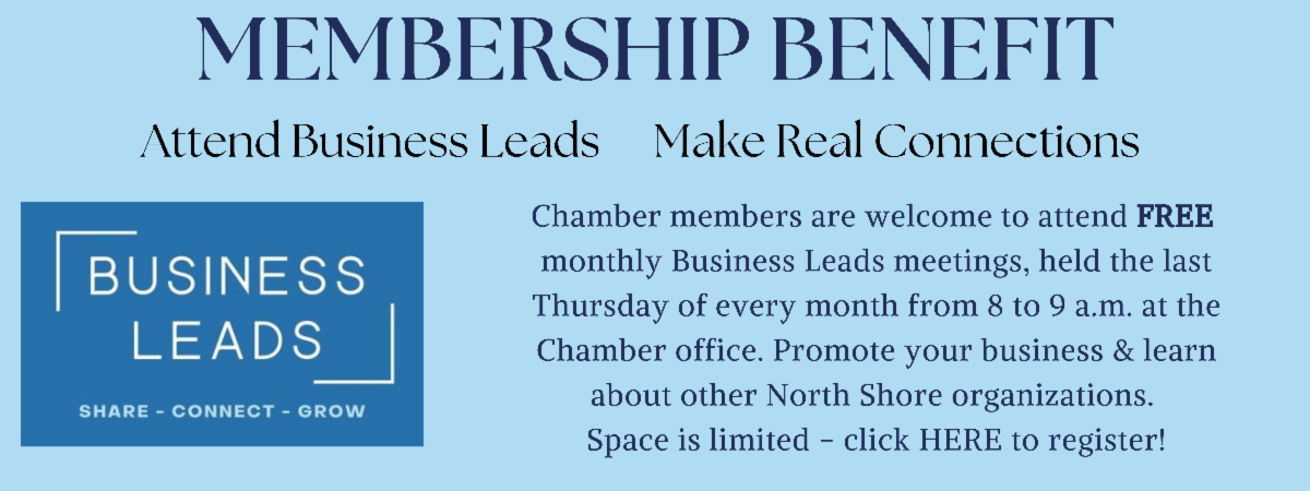 Please contact Karen Andreas, President and CEO of the North Shore Chamber of Commerce, or any staff member if we can assist with your business needs. Email karen.andreas@northshorechamber.org.