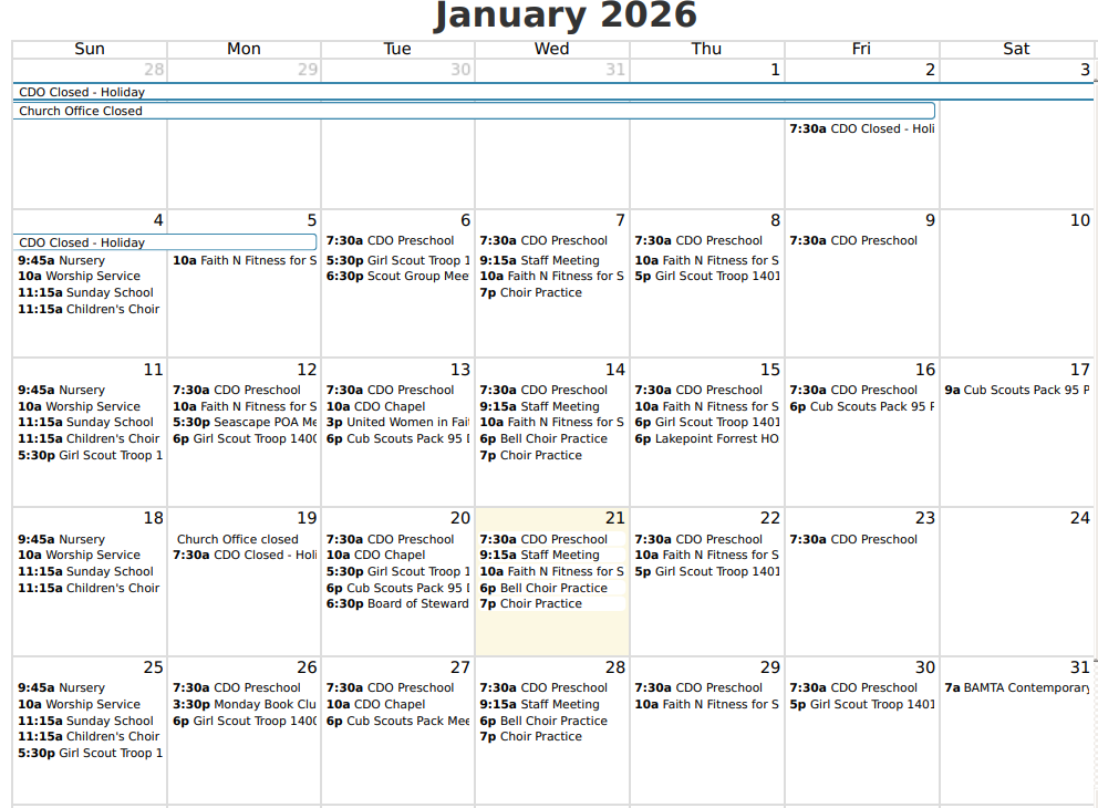 All new Newsletter articles need to be submitted to Velita Way at the church office, velita@seabrookumc.org by Monday afternoon.