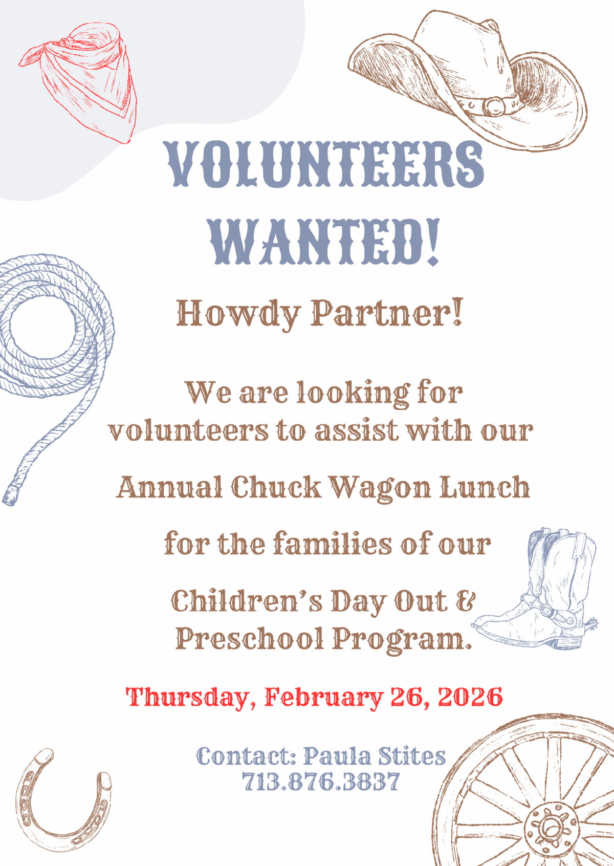 Our coordinator is Hilary Gibbs. If you would like to get involved, please contact Hilary at 832-385-2414 or Velita at the church office