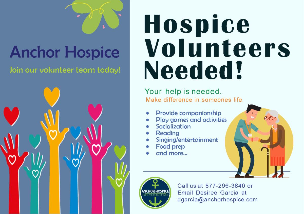 My name is Desiree and I am the Volunteer Coordinator at Anchor Hospice. I wanted to reach out to see if any members of your church would be interested in volunteering with our company. Anchor Hospice is rated in the top 10 hospices in the Houston area based on our google reviews. Most of our patients are located south of the Hwy 59 corridor. We have several patients in the Clear Lake, Pasadena, Texas City, and Pearland areas. There are many opportunities available that would make a meaningful impact on our patients and their families.