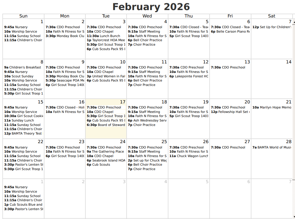 The United Women in Faith unit that meets at Seabrook United Methodist Church has decided to combine our two circle meetings into one meeting. All Christian women are invited to join us on the second Tuesday of each month at 3pm in our Fellowship Hall. March’s meeting will be on the 10th. Please consider joining us!!!