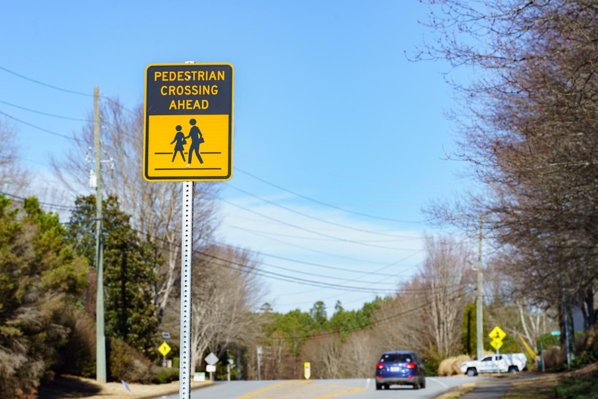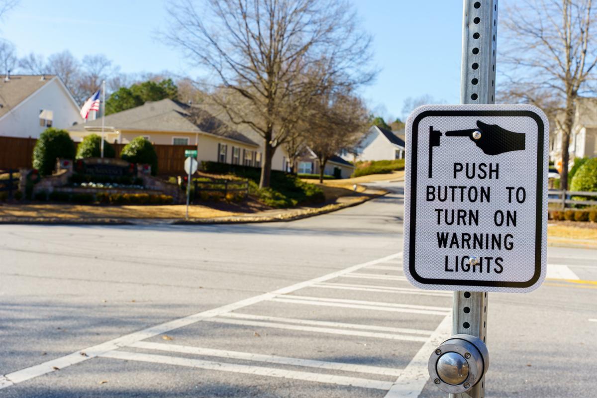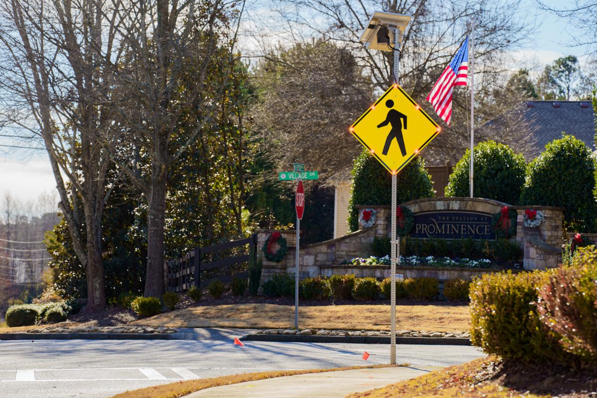 New pedestrian crosswalk flashing signs have been installed on Prominence Point Parkway/Keeter Road at the intersection of Village Drive and Holly Mill Village Drive.