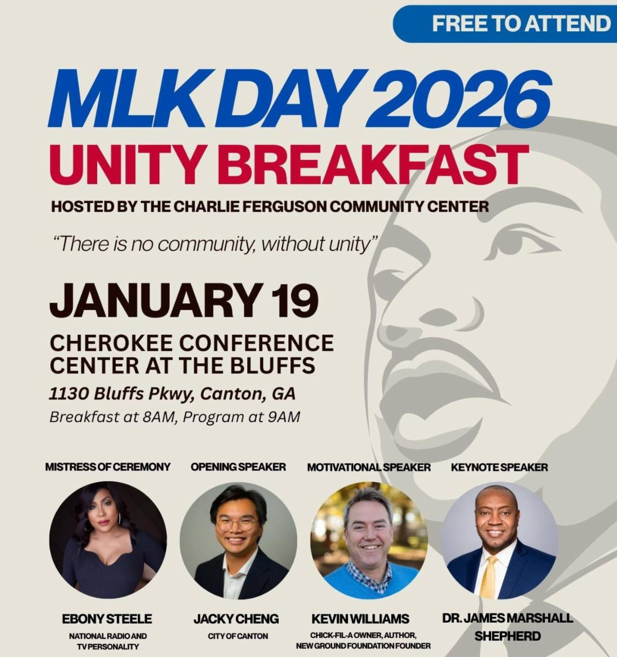 On Jan. 19, join the community to hear from speakers including Ebony Steele, National Radio and TV Personality; Jacky Cheng, City of Canton, Digital Content Specialist; Kevin Williams, Chick-fil-A owner, Author, and New Ground Foundation Founder; and Dr. James Marshall Shepherd, UGA Professor and Leading International Weather-Climate Expert