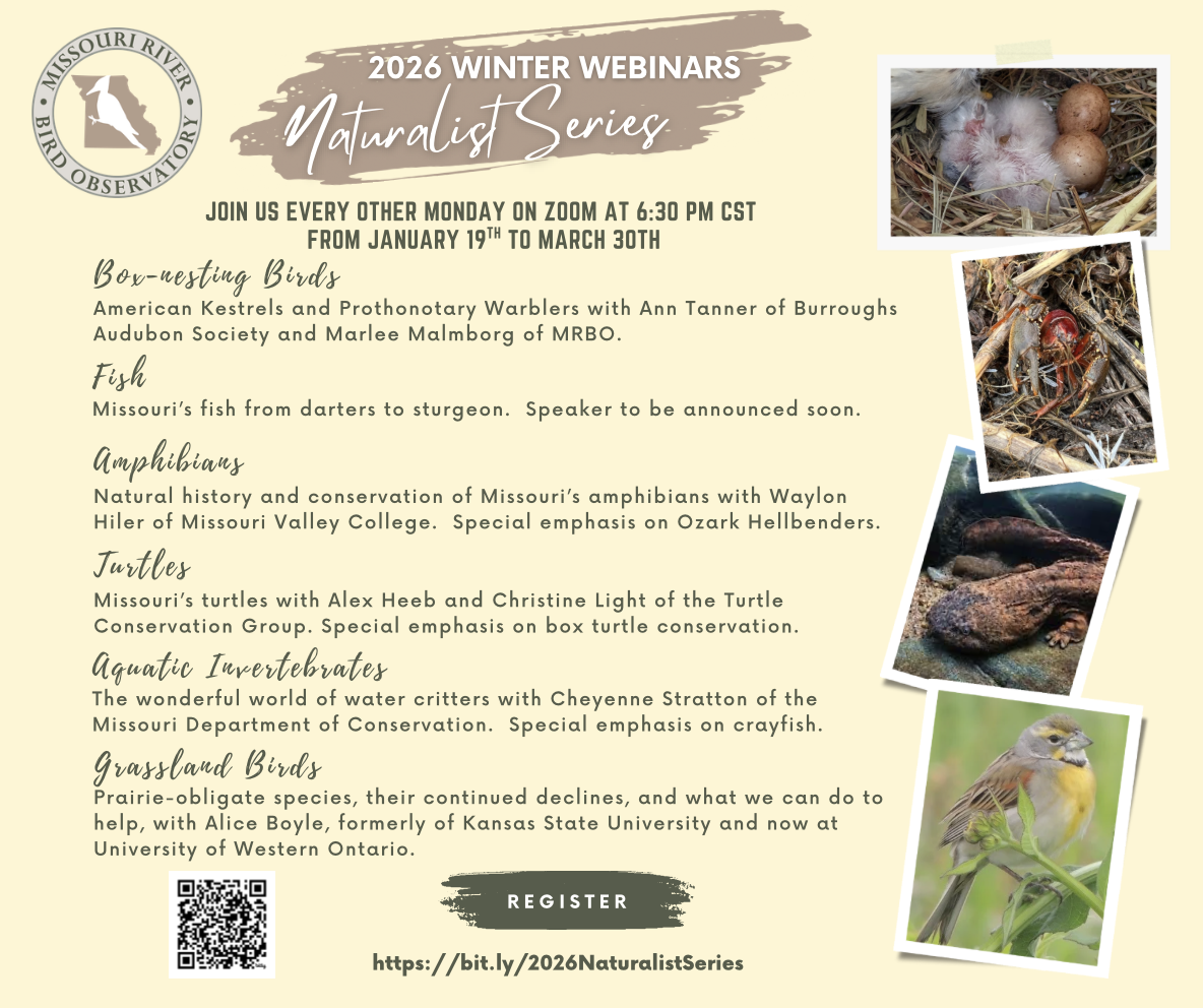 Find out how you can help St. Joseph become a Bird-Friendly community! MRBO's Kaylee Woelfel will share simple, practical ways to be bird-friendly in your home, neighborhood, and community. This program will touch on the 7 simple actions and how we can create safe spaces for our birds specifically during winter.