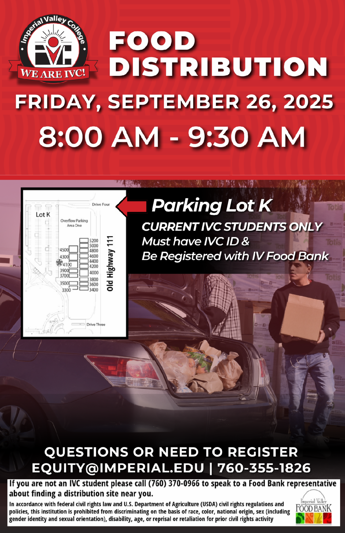 Our Basic Needs team and the IV Food Bank will be distributing food on Friday, September 26, 2025. Remember! You must present a valid Student ID and IV Food Bank card.