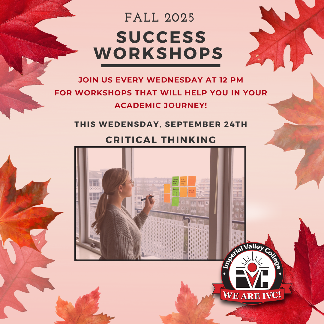 Join Learning Services Wednesdays at 12 PM in the Library (Room 1502) for free workshops designed to help you thrive at IVC!