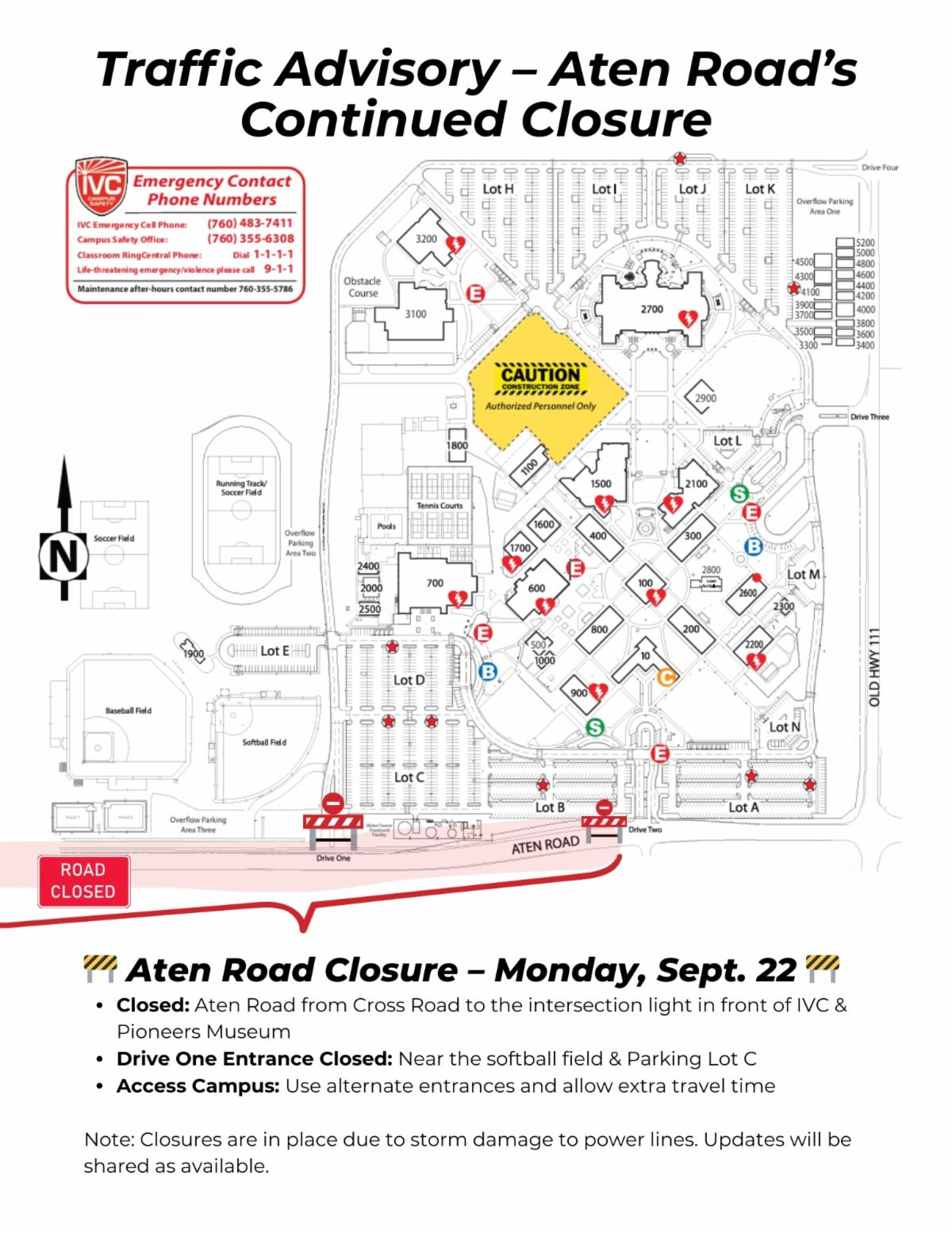 Closure Area: Aten Road is closed from Cross Road to the intersection light in front of IVC and the Pioneers Museum.
