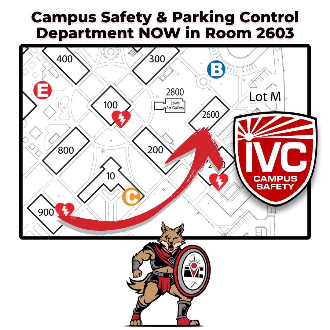 Remember! Campus Safety & Parking Control has moved to Room 2603! You can stop by Monday through Thursday from 8 AM to 10 PM.