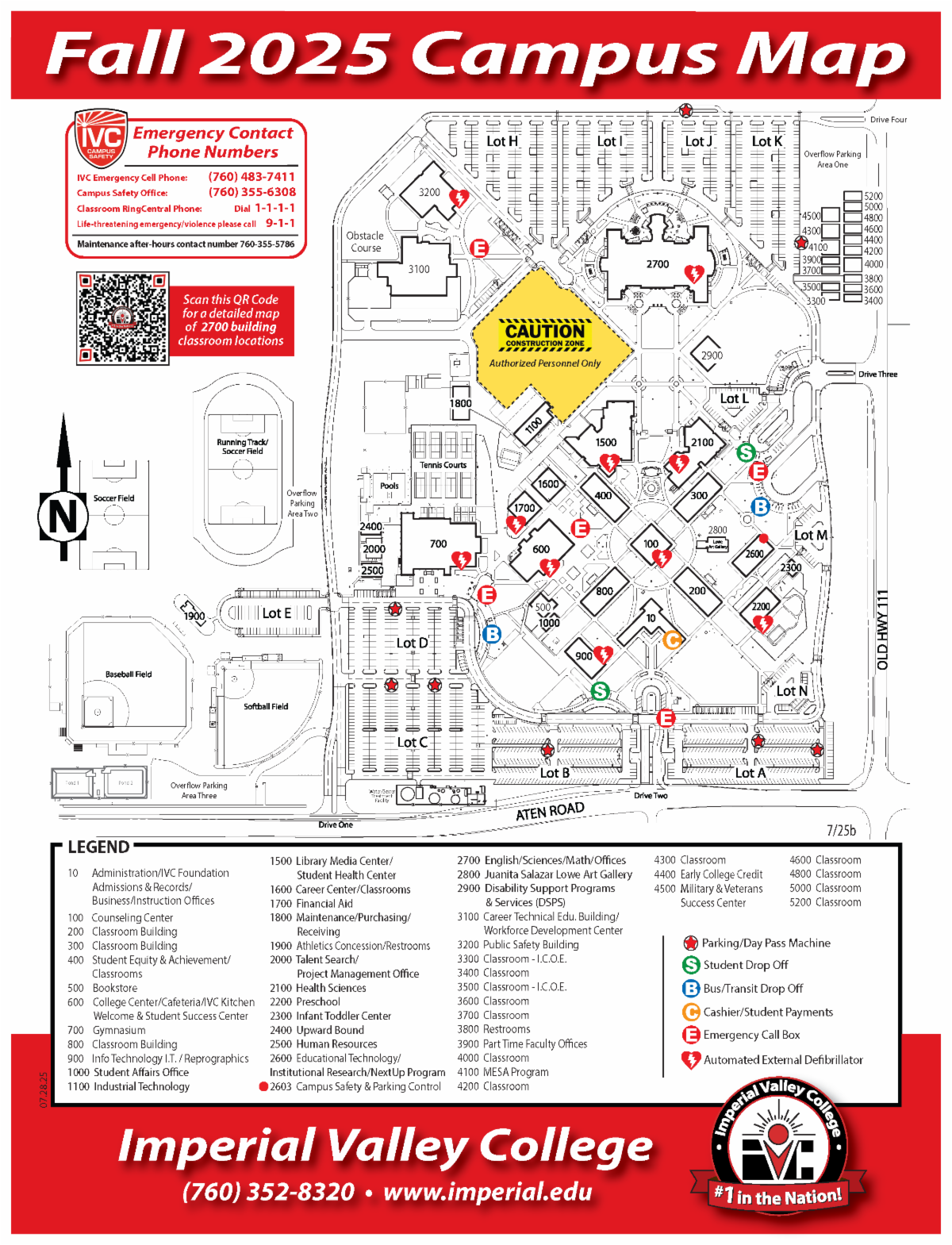 | | Not Sure Where to Go? Check Out the Campus Map! | | Remember to park legally, keep your permit visible, and always secure your vehicle. Need help? Our Campus Safety team is a phone call away and ready to assist you! Call 760-355-6308 or 760-355-6307 to speak with them. | | Are You a Veteran? Check out the MVSC! | |