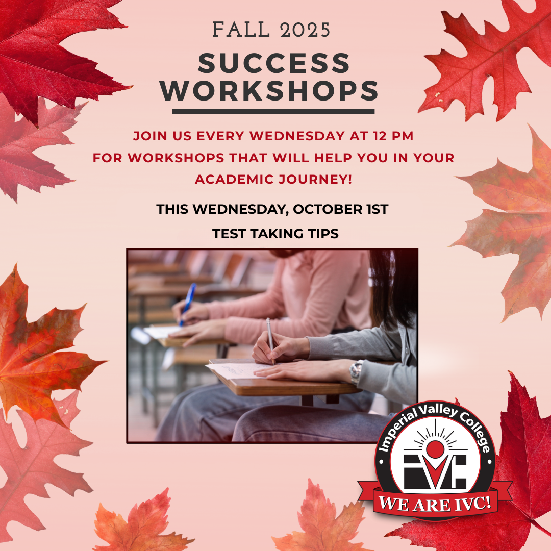 Join Learning Services Wednesdays at 12 PM in the Library (Room 1502) for free workshops designed to help you thrive at IVC!