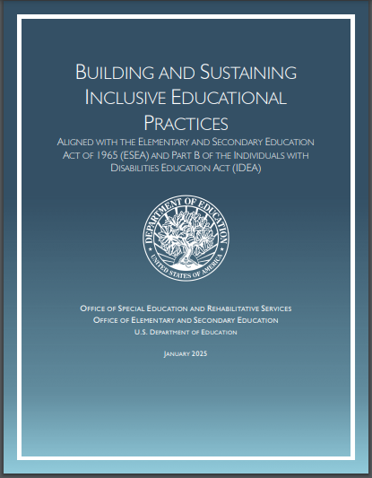 On January 16, 2025, the U.S. Department of Education released the guidance document, Building and Sustaining Inclusive Educational Practices Aligned with the Elementary and Secondary Education Act of 1965 (ESEA) and Part B of the Individuals with Disabilities Education Act (IDEA), to help state educational agencies, local educational agencies, and school staff to foster inclusive and effective learning environments.