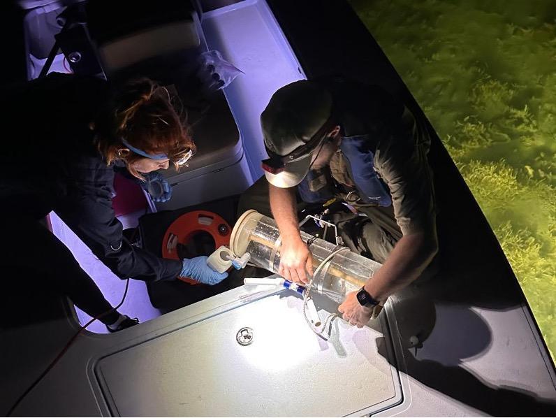 | | FWC researchers collect water samples in the Florida Keys with Capt. Chad Huff. Photo Courtesy LKGA (Courtesy of Bonefish & Tarpon Trust). | | |