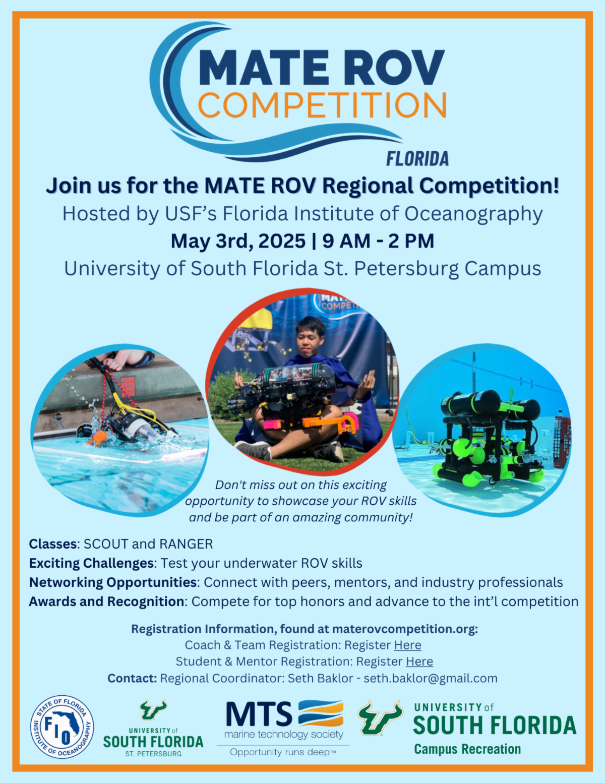 As part of this collaboration, FIO will serve as the regional coordinating body for the Florida Regional MATE ROV Competition, which will be held at USF St. Petersburg on May 3. This annual event challenges students to design and then operate their remotely operated vehicles (ROVs) to tackle real-world marine and freshwater science and industry tasks as teams.