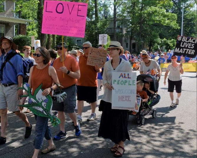 St., by 9:00 a.m. on July 4. Arrive between 8:00 and 9:00 a.m. Wear a solid-colored shirt in a color of the rainbow (ROYGBIV), tie dye, or UU T-shirt, if possible. We have signs to be carried, bubbles to blow, songs to sing, and more.